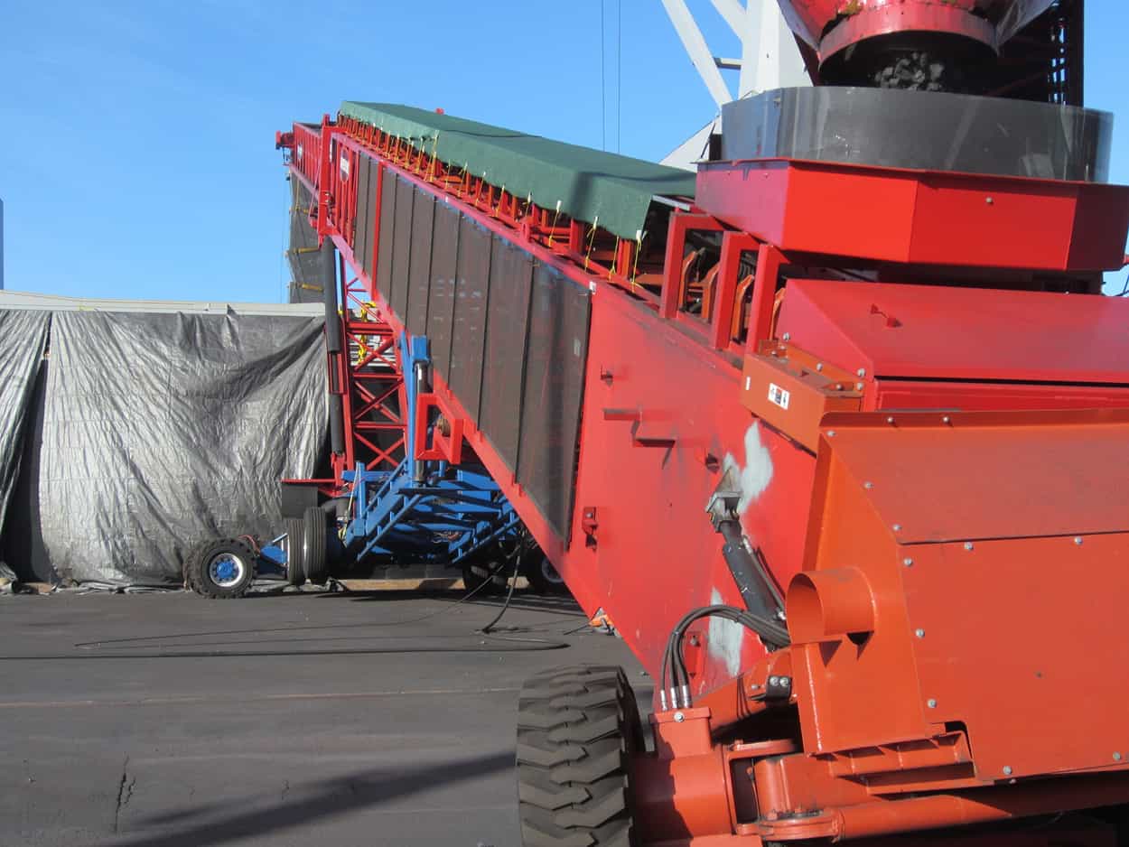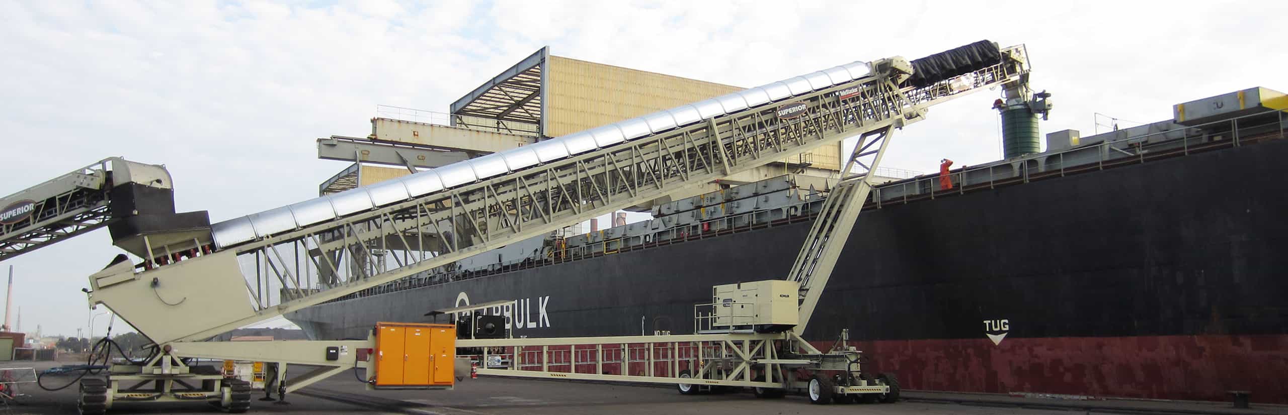 Bulk Conveying Equipment (BCE) deployed a customized mobile ship-loading system from Superior Industries: a 72" RazerTail® Truck Unloader plus two TeleStacker® Conveyors (150' and 170').