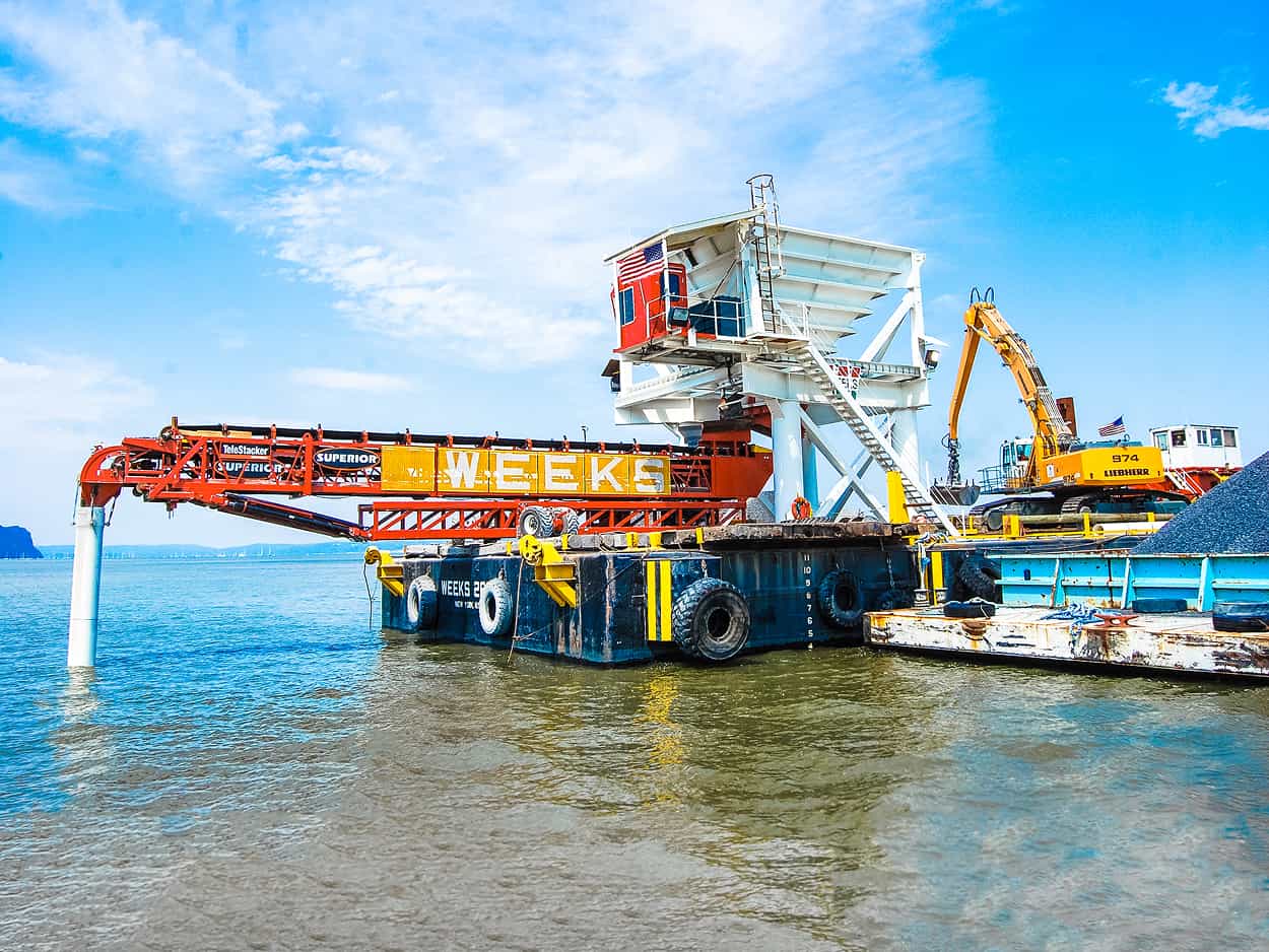 Dredging was required to create enough depth at the Hudson River for cranes and other equipment used in building a new bridge in New York City. Weeks Marine used a custom barge-mounted TeleStacker Conveyor to cap the dredge site, with sand and stone coming from the Port of Coeymans.